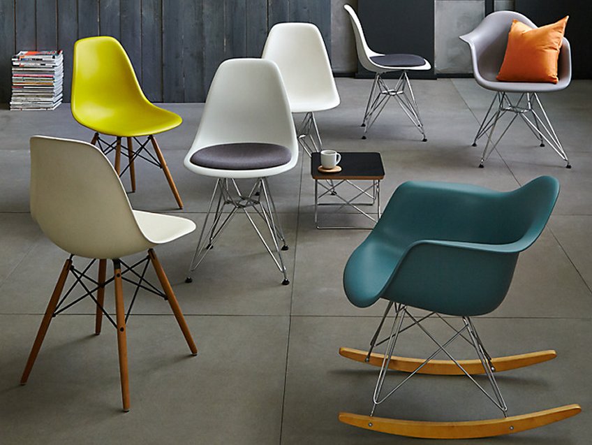 Above: the Vitra Eames DSR Side Chair and RAR Rocking Chair are contemporary versions of the original fibreglass designs (1948) for the Museum of Modern Art in New York’s Low-Cost Furniture Design Competition. Below: Eames Lounge Armchair and Ottoman in white leather/walnut.